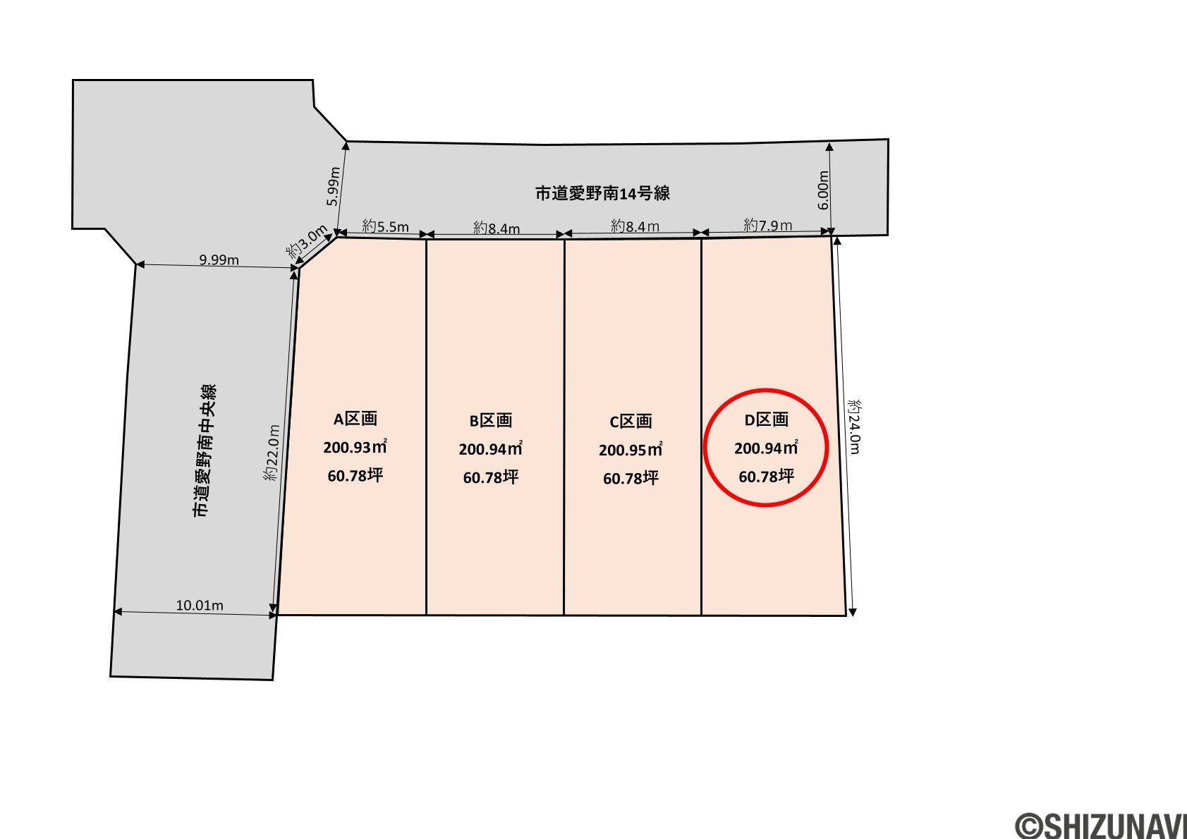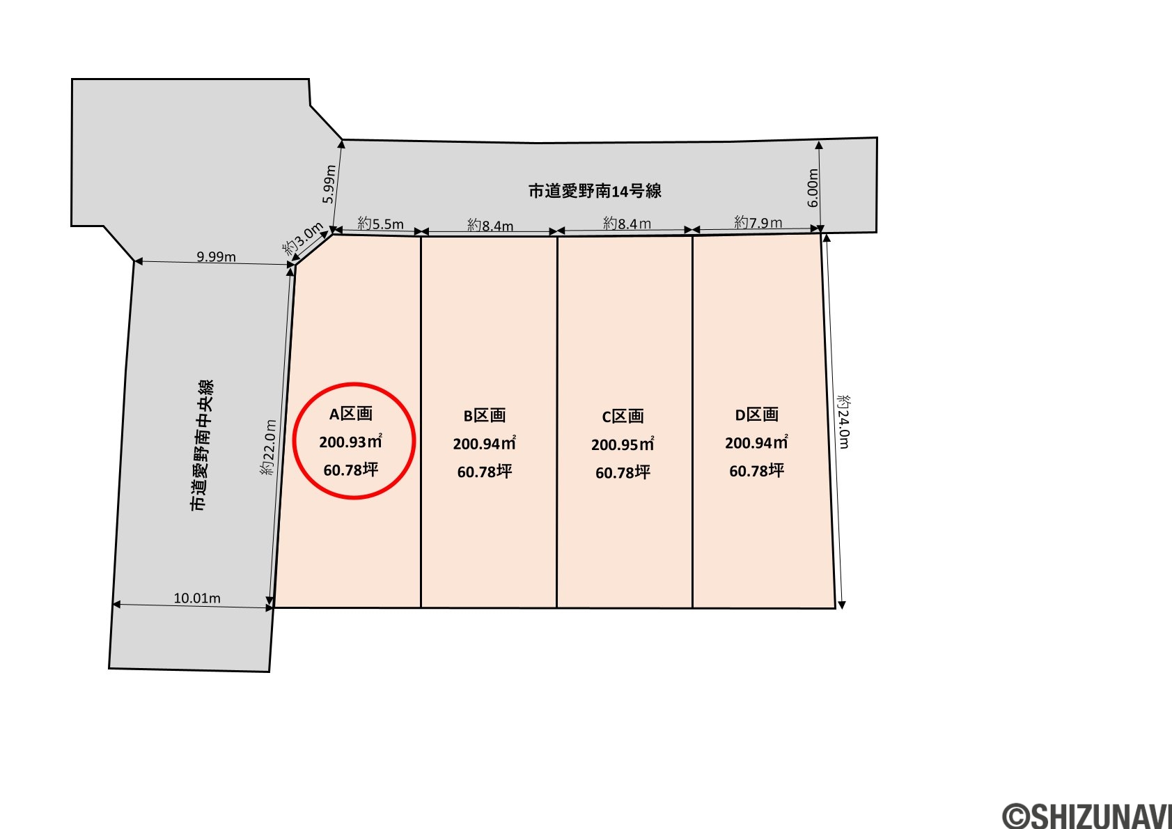5.9~10.0m幅(アスファルト舗装) A区画:西側幅員約10mの公道に約25m接道 |