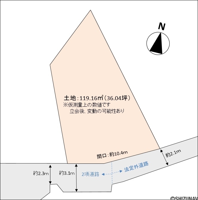 2.1~3.3m幅(無舗装) 2項道路と接している部分のみセットバックが必要です。(4㎡~5㎡) |