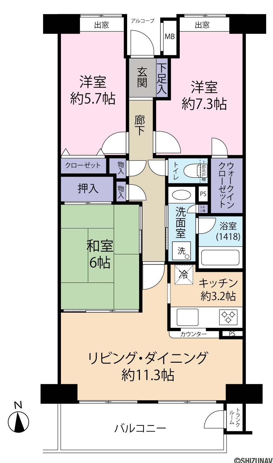 ●3LDKの使いやすい間取。洋室7.3帖、5.7帖とゆとりある広さ
