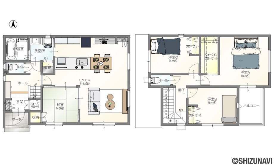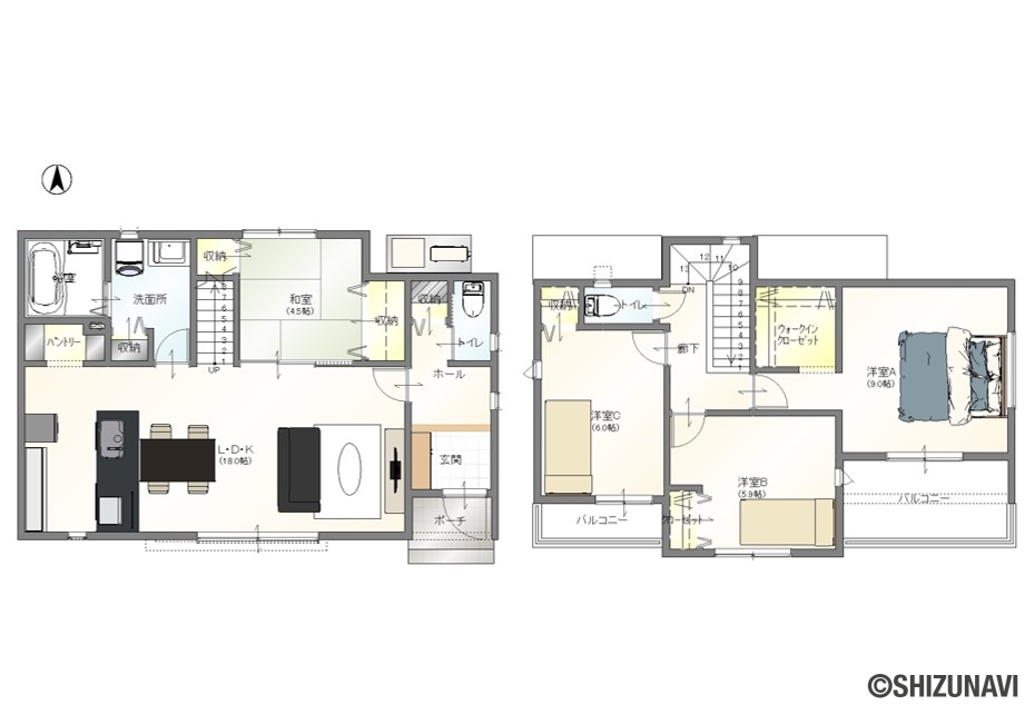 ■全2棟ともに、リビングに4.5帖の和室を備えたゆとりあるプラン。