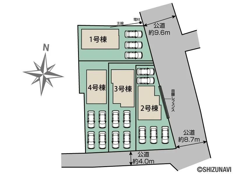 8.7・4.0m幅(アスファルト舗装) 東8.7m公道、南4.0m公道 |