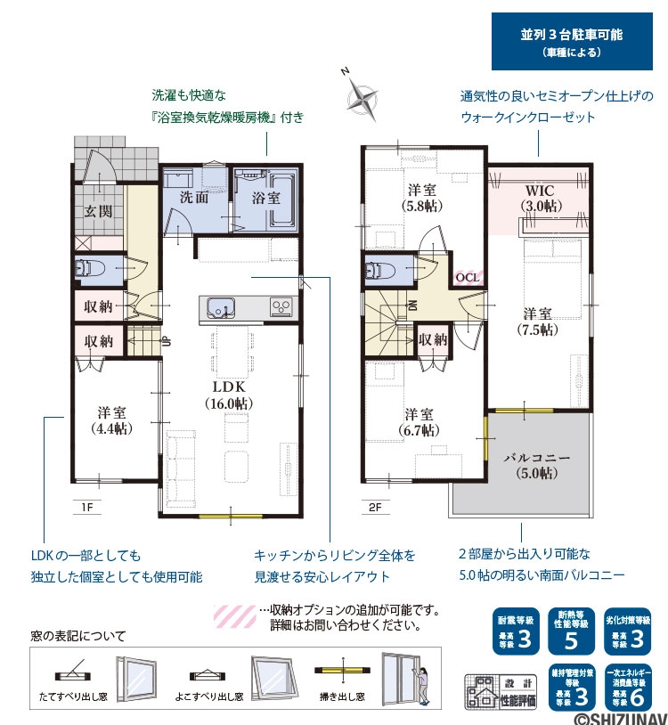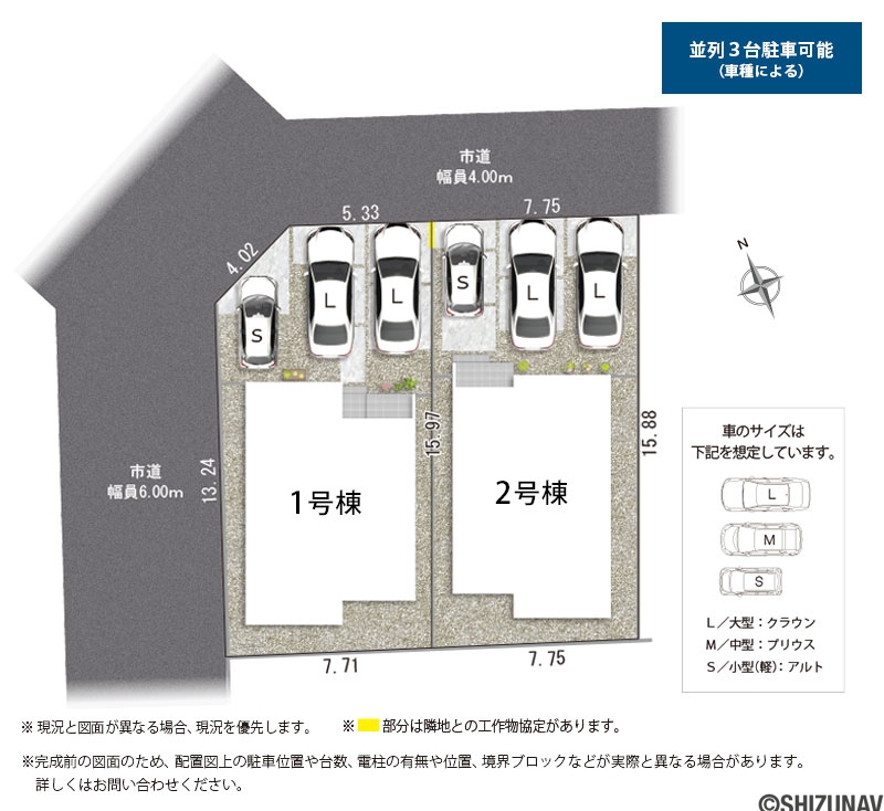 ●並列駐車3台可能な、ゆったりとした広さの敷地。(※車種による)