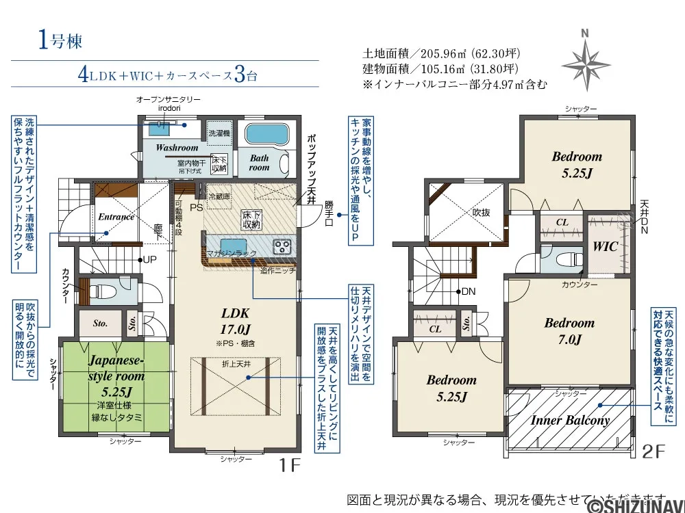 - フローリング インナーバルコニー 4LDK 折上天井 外水栓 耐震等級3 LED照明(玄関・廊下・キッチン・トイレ・洗面所)